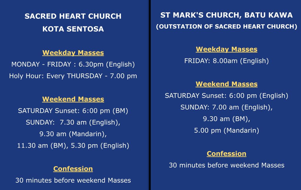 Home News & Events Mass Schedule Mass Schedule For All Souls DayMasses for All Souls Day on the 2nd of November (Sunday) are as followed: –7.30am English Mass followed by the Blessing of Cemetery,9.30am Chinese,11.30am BM, and5.30pm EnglishThe Blessing of Cemetery Blessing of Catholic Cemeteries is on All Souls’ Day, the 2nd of November are as followed: –8.45am – Sacred Heart Cemetery (after the 7.30 am English Mass)9.00am – The Lord’s Resting Ground 9.30am – Immaculate Heart Catholic Cemetery SHC Calender Of Events Mass Reading Of The Day Roman Catholic Archdiocese Today's Catholic Publication Herald Malaysia Online Web